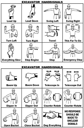 Below are common hand signals for communication with excavation and the movement of heavy equipment: