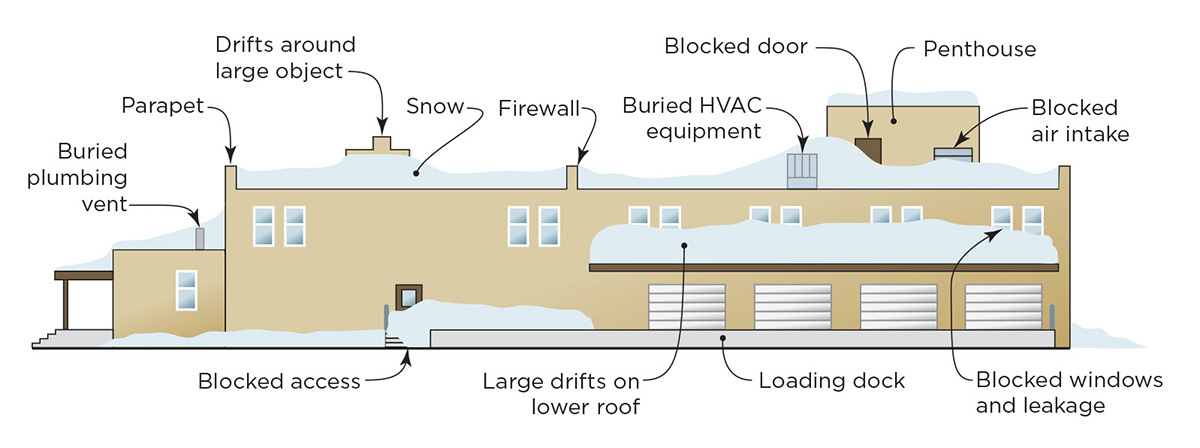 - Know the maximum snow depth your building can safely handle. This may vary with different portions of the building, especially if later additions were completed. Structural engineers can determine the acceptable depth by calculating the roof’s live load capacity.