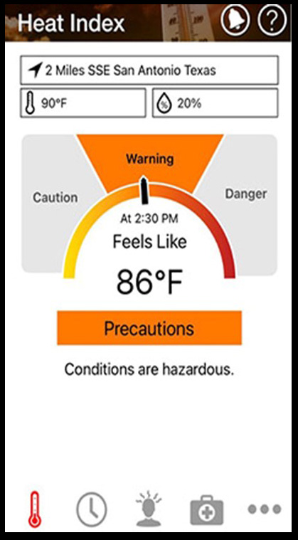 - Monitor the temperature and humidity throughout the day such as by using the free NIOSH/OSHA Heat Safety Tool App (see screen image at right), to adjust the work plan as needed.
