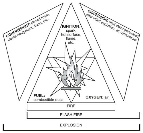 The dust explosion pentagon below depicts the five elements necessary for a dust explosion to occur: