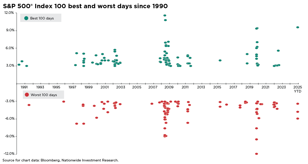 What happened next was extraordinary. On April 9, the S&P 500 jumped 9.5%—one of its biggest single-day gains in 35 years—wiping out the entire tariff-driven decline. This pattern aligns with historical trends: nearly half of the S&P 500’s 100 best days since 1950 occurred within just five trading days of the worst ones. An even larger share—79%—took place within 20 trading days.