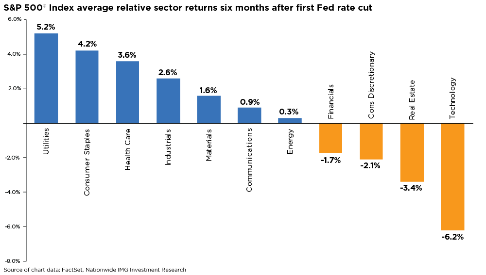 - Defensive sectors often outperform the market in the six months following the first Fed rate cut.