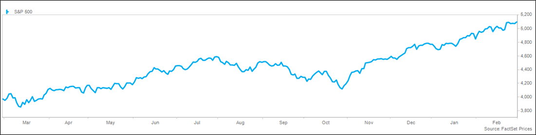 The Senate passed a stop-gap spending package, sending it to President Biden for approval. The bipartisan (77-13) vote will avert a government shutdown that was set to occur on Friday. Biden said the passage was good news for Americans because it avoids a damaging shutdown, but added, “This is a short-term fix, not a long-term solution.” The bill simply moves the deadlines from the two-stage shutdown from March 1 and March 8 to March 8 and March 22 to provide more time for a long-term solution. There is a statutory requirement for a 1% sequestration after April if no deal is reached. The market has largely ignored the risk of a government shutdown or incremental fiscal slowing. The Congressional Budget Office is projecting a $500 billion improvement in the budget deficit over the next eight months, down from $2.1 trillion today to $1.6 trillion by September 30, driven by increased tax revenue on higher capital gains. Congress is in bipartisan discussions on a tax cut bill that would create $200 billion in stimulus in the first two years, largely for corporations on R&D tax credits and expensing of depreciation.