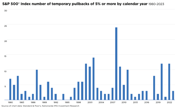 While the recent 4-month rally can conceivably continue because of favorable economic and fundamental tailwinds, we should acknowledge the historical trends; since the 1980s, the market has experienced a temporary decline of around 5% or more almost yearly. Rather than trying to predict corrections, consolidations or market peaks, which both the bulls and bears love to debate, investors should prepare for potential market volatility by ensuring their portfolios are aligned with their risk tolerance. By staying disciplined and sticking to a long-term investment strategy, investors are equipped to navigate the inevitable ups and downs of the market.