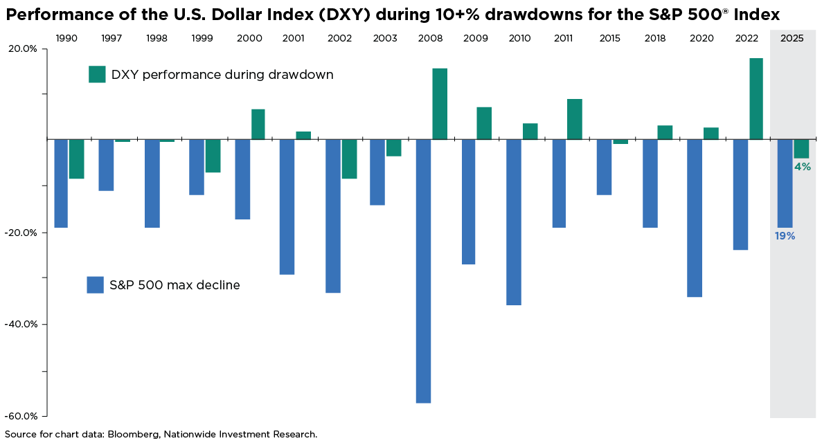 Historically, the dollar tends to strengthen during periods of significant equity market stress. Since 1990, the DXY has typically delivered positive returns in years when the S&P 500® Index experienced drawdowns of over 10%. While the S&P 500 briefly crossed that threshold earlier this year—before recovering—the dollar has moved in the opposite direction, defying the usual pattern.