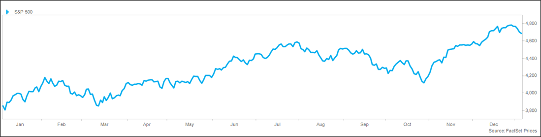 Inflation data this week was encouraging to investors. Thursday’s reading on consumer price inflation was a bit hotter than expected, with headline CPI up 3.4% from a year ago (above the 3.2% consensus and 3.1% in November) and core up 3.9% (versus 3.8% consensus and 4.0% in November). Investors largely shrugged off the upside to consensus, as two-thirds of the year-over-year increase was driven by shelter costs (+6.2%) that are impacted by the lag in the calculation of owner-equivalent rent. Wages remain under control, up just 0.8% from a year ago. Producer price inflation rose just 1.0% in December, below the 1.4% consensus but up from 0.8% in November. Core PPI rose 1.8%, below the 2.0% consensus and November reading. Easing pressure on producer prices is likely to lead to lower consumer price pressure in the coming months.