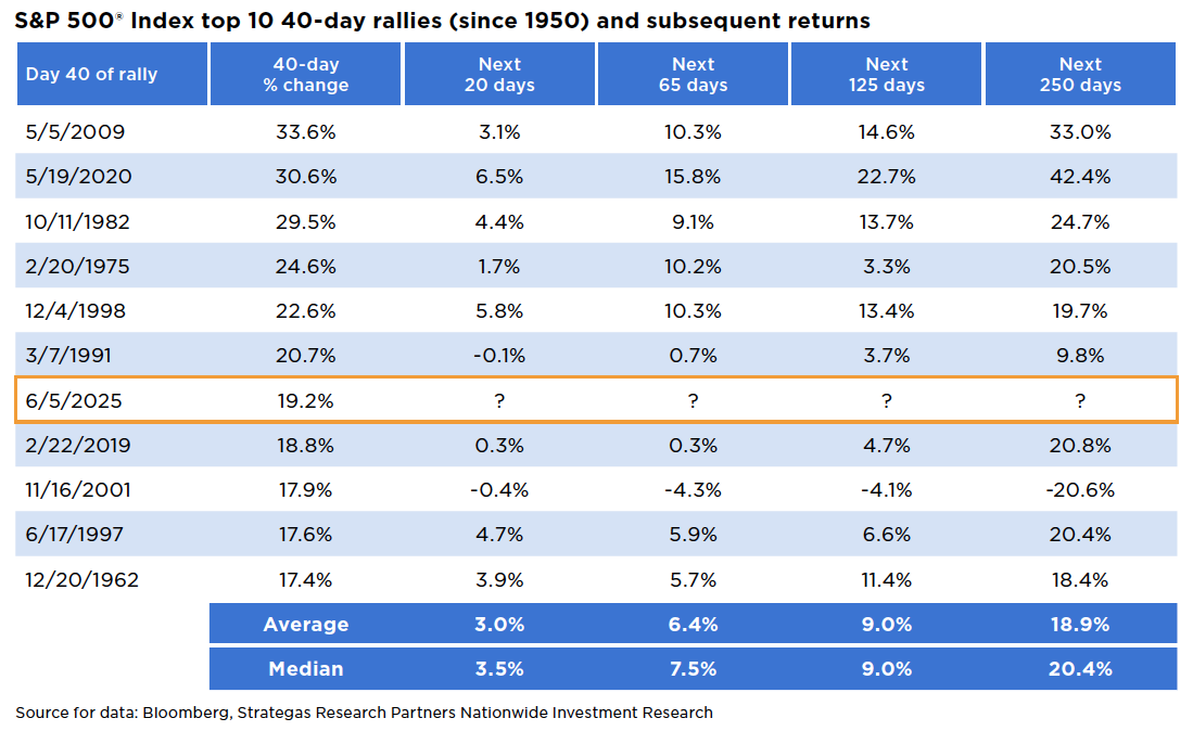 06/12/2025 – The S&P 500® Index has staged a strong rally since its April 7 low, following President Trump’s decision to pause his proposed “Liberation Day” reciprocal tariffs. From that point through Thursday, June 5, the index gained 19.2%—marking one of the ten strongest 40-day advances for U.S. equities since 1950.