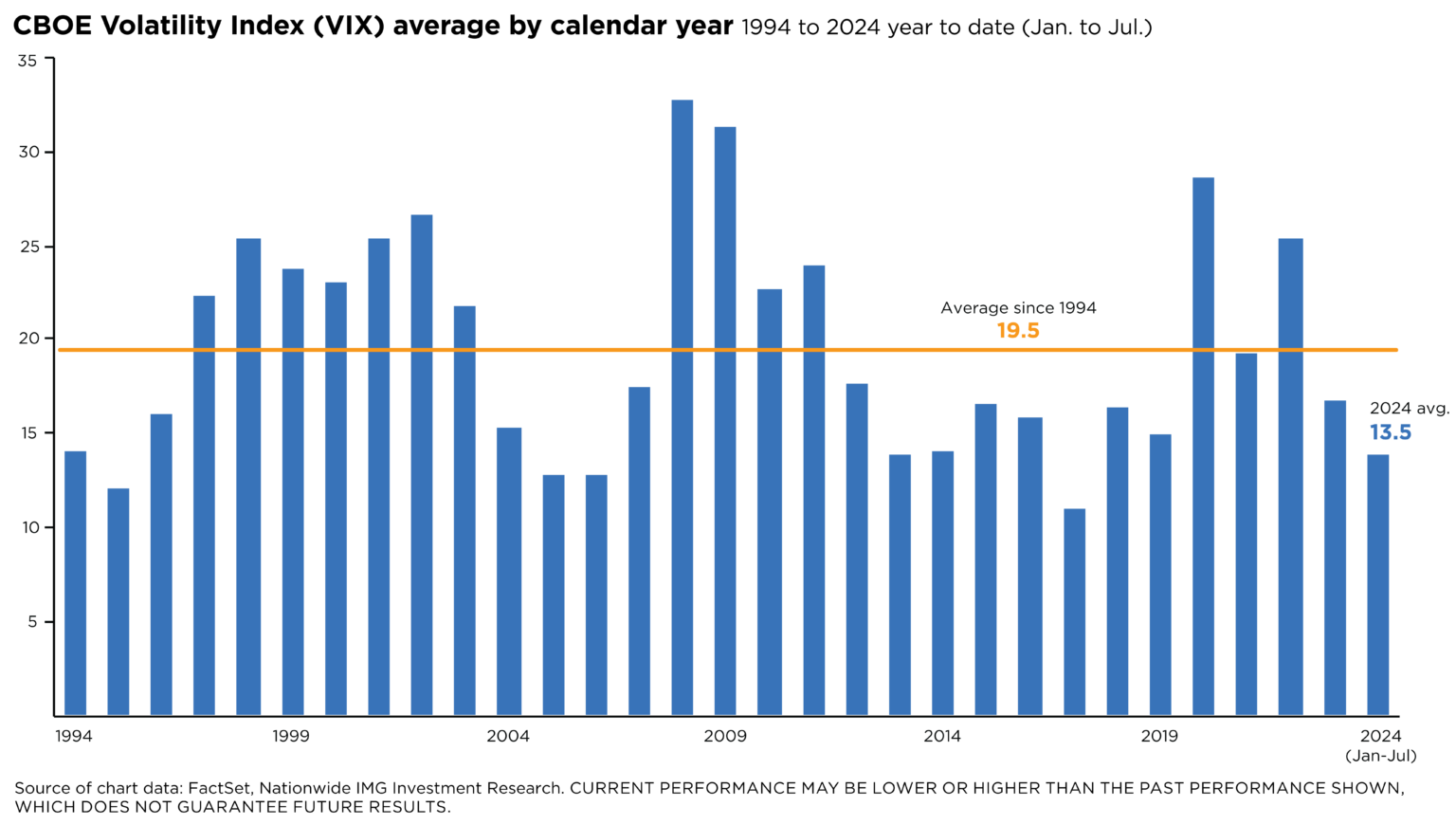 The calm among stock investors earlier this year was pleasant while it lasted. Still, the latest surge in volatility serves as a reminder of the fleeting and unpredictable nature of the market. As the accompanying chart illustrates, 2024 had been shaping up to be one of the calmest years for stocks; for the year to date through July, the VIX average was well below its 30-year average and at its lowest level since 2017. This occurred despite different economic signals that typically spark volatility, including a declining Leading Economic Index, contraction in the ISM Manufacturing Index, and a yield curve that’s been inverted for more than two years.