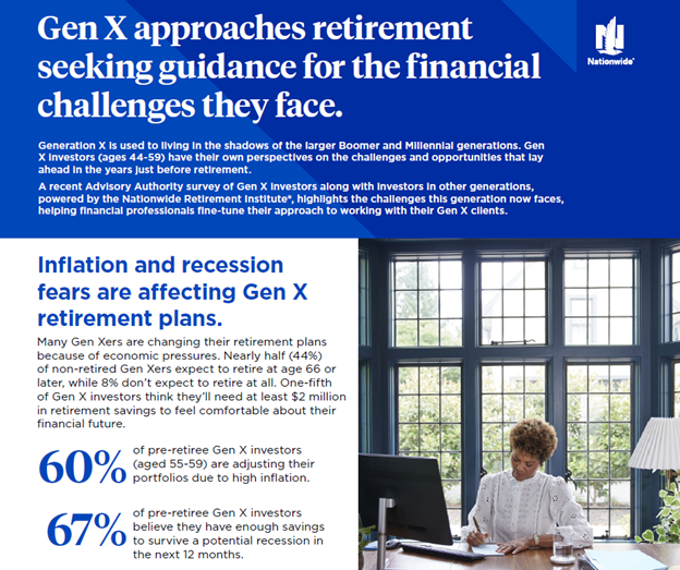As part of the tenth annual Advisor Authority survey, powered by the Nationwide Retirement Institute®, we explored the specific challenges and concerns that Gen X investors are facing as they prepare for retirement. Many are adapting their financial plans to current economic conditions, but there’s plenty of opportunities for financial professionals to help their Gen X clients manage their specific financial concerns and feel better prepared for their financial future.
