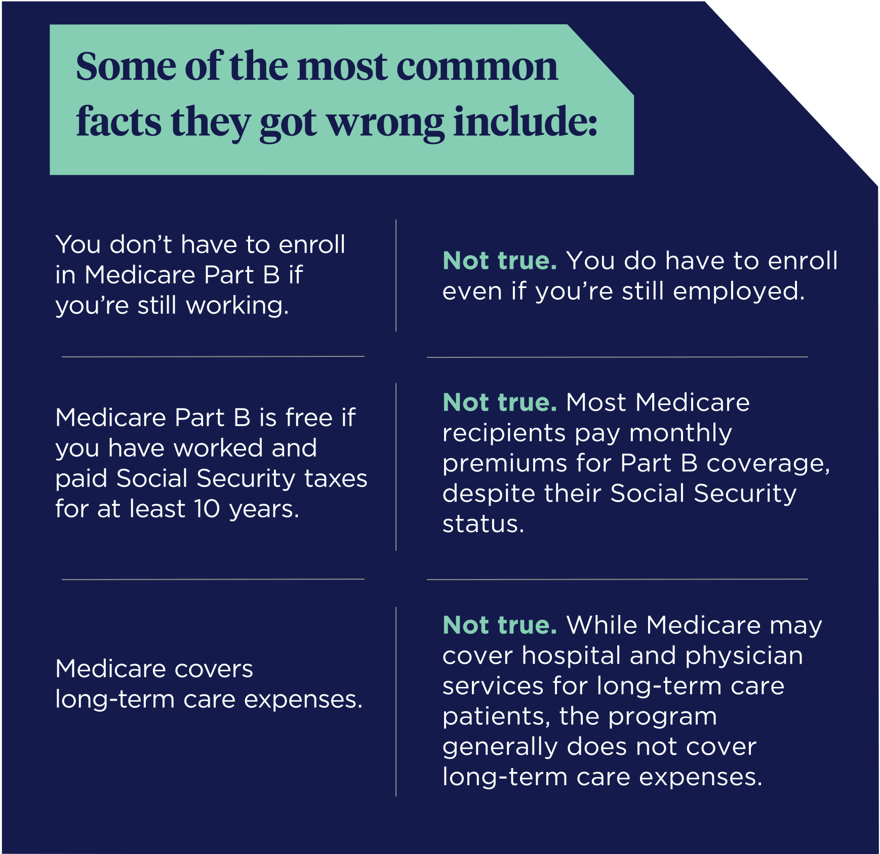 For example, we quizzed survey respondents on some of the basics of Medicare. In a true-or-false question format, many people either answered the questions incorrectly or weren’t sure.
