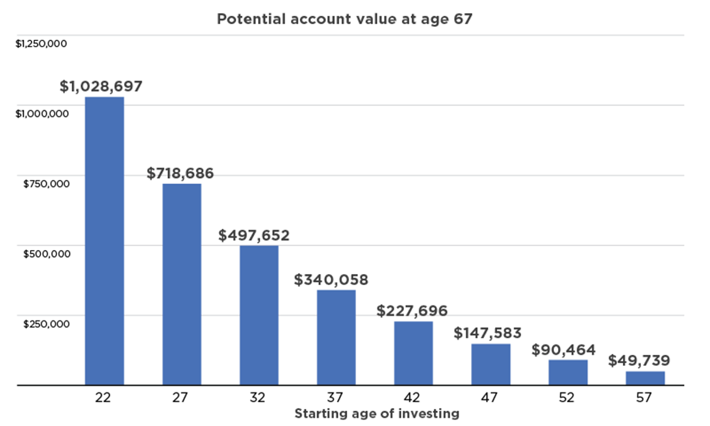 These early years of adulthood are also an important time for saving for the future. We know that starting early on a savings plan and tapping the power of compound growth has a huge impact on future financial security. Saving early in your career also helps build a healthy habit that can last a lifetime.
