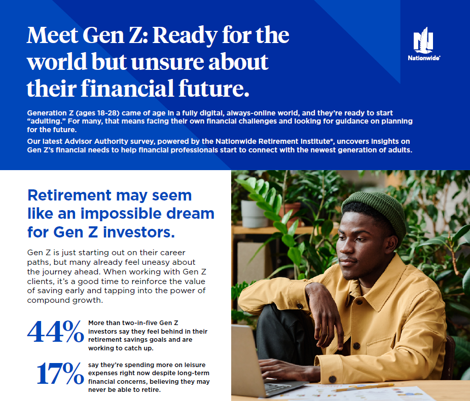 In our latest Advisor Authority survey, powered by the Nationwide Retirement Institute®, we polled Gen Z investors about their financial habits and views toward retirement advice. For these young people, retirement may seem like a lifetime away and feel like a very steep mountain to climb. That could explain why 44% of Gen Zers we surveyed say they feel behind in their retirement savings goals and are working to catch up.
