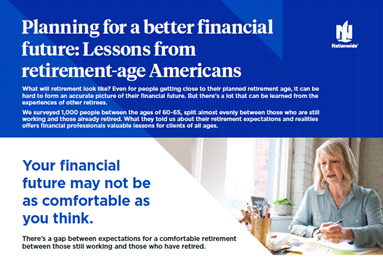 In your role as a financial professional, you can turn to Nationwide for insights, tools and resources on Social Security and retirement health care cost planning to help you address your clients’ needs for savings, income, and protection. Solutions from our full suite of annuities, life insurance, mutual funds, and workplace retirement plans help simplify the complexities of retirement planning so you can better prepare your clients for a more secure financial future.