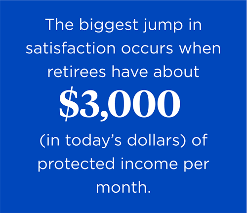 Our research uncovered a clear connection between the amount of guaranteed income a retiree receives and their overall retirement satisfaction. We analyzed data from the Health and Retirement Study (HRS) — a survey of approximately 20,000 older Americans conducted through the University of Michigan1 — and what we saw revealed that while any level of guaranteed income that supplements Social Security benefits improves confidence, the biggest jump in satisfaction occurs when retirees have about $3,000 (in today’s dollars) of protected income per month. This threshold creates an income floor that allows retirees to spend more freely without the fear of depleting their savings.