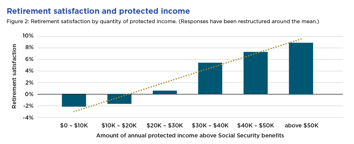 Retirees who have more protected income are more satisfied with their retirement. Even at the highest levels of net worth, retirees with more protected income were significantly more satisfied.
