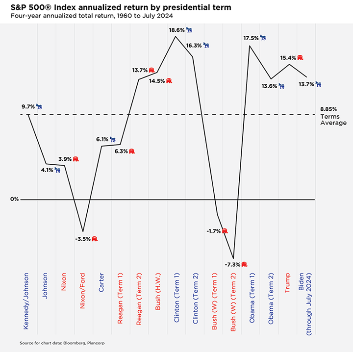 For example, look at the average annual stock market returns (as represented by the S&P 500® Index) for the last half-century. The average yearly return of the S&P 500 over the last 50 years is 11.86%, as of the end of July 2024 (assuming dividends are reinvested)1. Therefore, maintaining a focus on sound investment principles and long-term strategies is crucial, rather than reacting impulsively to political events.