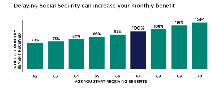 You can start collecting Social Security as early as age 62, but that could permanently reduce your benefits by up to 30%.1 The amount you receive increases each year that you wait to file between ages 62 and 70 (see “Delaying Social Security” chart). Key things to know: