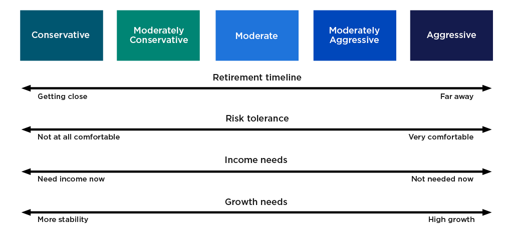 Use this chart to help identify what kind of investor you are: conservative, moderate, aggressive or somewhere in between. Ask yourself the following and think about where you land on the spectrum: